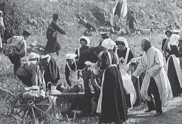 Батальные сцены ставил сам Ханжонков – как кадровый военный, как режиссер по душевной склонности. И вся пресса (обширная!) отмечала, что особенно удались именно баталии и массовые картины: эвакуация города, проводы новобранцев, прием раненых в госпитале и особенно штурм Малахова кургана, снятый с панорамами двумя камерами – со стороны тех, кто обороняет редут, и со стороны нападающих.