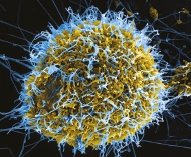 Раскрашенное изображение вируса Эбола, полученное с помощью сканирующего электронного микроскопа.