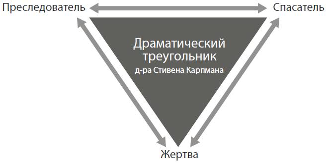 В драме только три главные роли, но сам треугольник как символ имеет решающее значение для понимания ее механизма. Прежде всего отметим, что перед нами равносторонний треугольник. Все его стороны имеют одинаковую длину, а углы равны. Это означает, что каждая роль одинаково ответственна за драму. Кроме того, треугольник стоит на своей вершине, что иллюстрирует шаткость его позиции и лишний раз подтверждает крайне изменчивую динамику драмы. Конструкция может опрокинуться в любой момент. Жертва находится внизу – именно так она себя позиционирует, выбирая самое проигрышное положение. Двунаправленные стрелки показывают порочную взаимозависимость ролей. Ни одна из них не может оправдать свое существование без участия другой, дополняющей роли. Жертва необходима преследователю как объект нападок. Без спасателя жертве не от кого ждать помощи. В отсутствие интриги преследователь – жертва спасателю просто некого спасать.