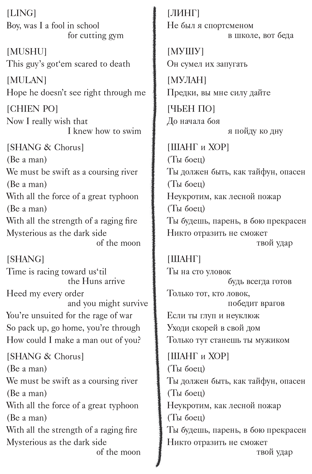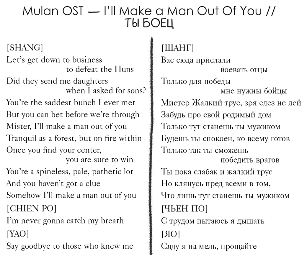 Саундтреки к диснеевским мультикам – отличный материал. Перевод в них должен быть максимально приближен к оригиналу, чтобы соответствовать истории. Предлагаю рассмотреть «lyric setting» на примере текста песни из мультфильма «Мулан».