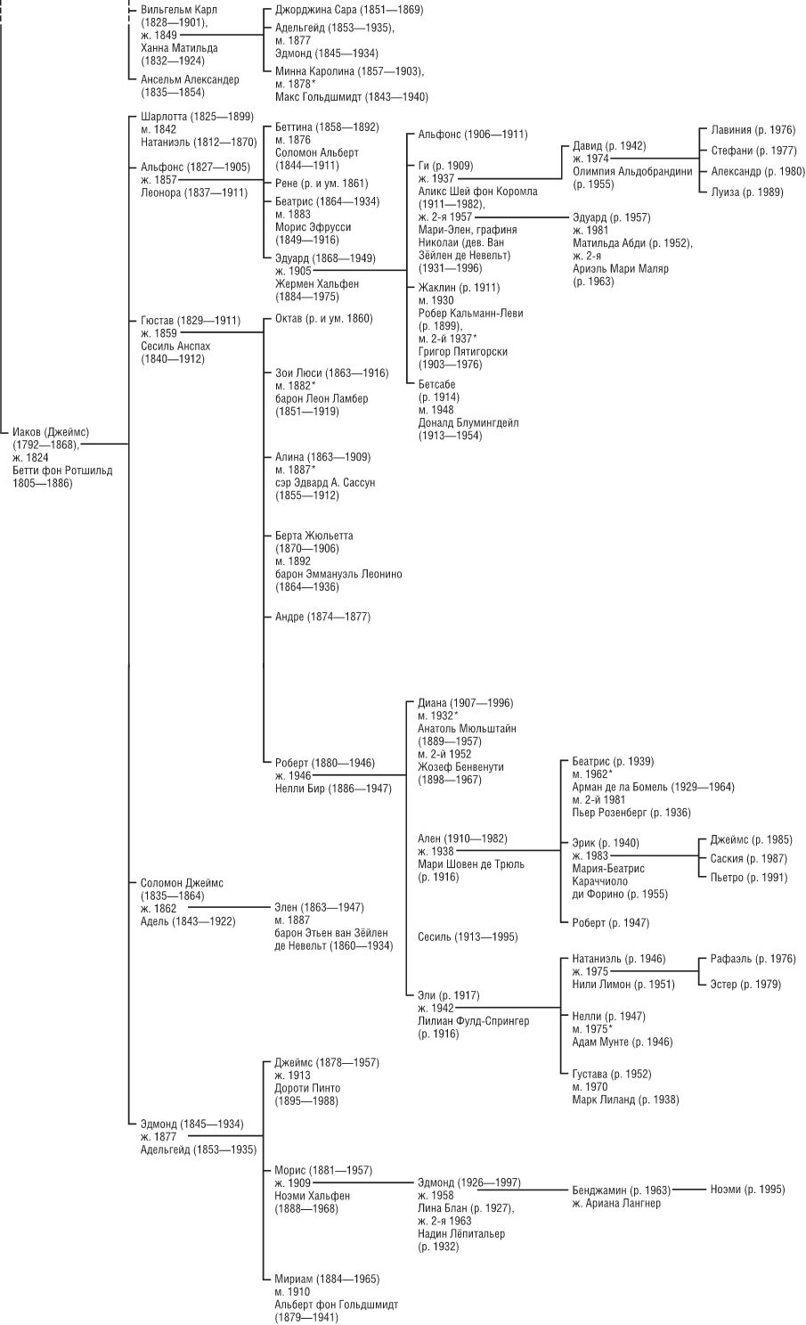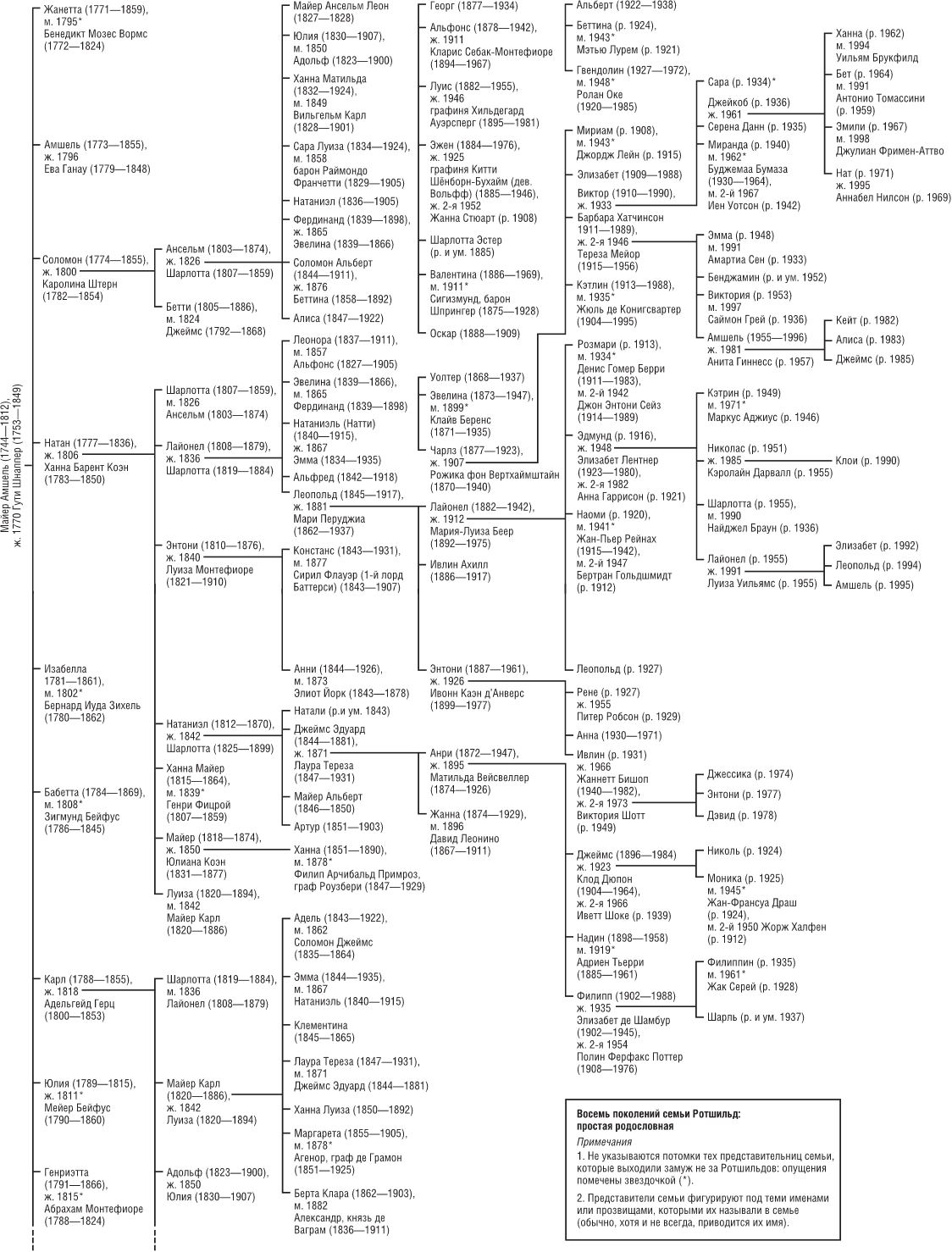 И все же нельзя безоговорочно отождествлять Ротшильдов с более широкими слоями еврейского населения. От остальных европейских евреев их отделяло не только богатство. Родословная Ротшильдов также отличается своеобразием. Дело в том, что среди Ротшильдов была широко распространена эндогамия – они были сторонниками браков не просто с единоверцами, но и с членами собственной семьи, с близкими родственниками. Им казалось, что Ротшильду подходит только другой Ротшильд: из 21 брака, заключенного детьми и внуками Майера Амшеля в период 1824–1877 гг., не менее чем в 15 супругами становились его прямые потомки. Типичным примером может служить женитьба Лайонела, сына Натана, на Шарлотте, дочери Карла, в 1836 г. Брак был устроен родственниками и оказался не очень счастливым. Главным обоснованием для такой стратегии было укрепление связей в пределах семейной финансовой компании. План достиг своей цели, хотя на современный взгляд родословное древо того периода выглядит сомнительным с точки зрения генетического риска. Браки между кузенами способствовали тому, что фамильное состояние не распылялось. Подобно строгому правилу, согласно которому дочери и зятья не допускались к священным гроссбухам компании, и повторению завета Майера Амшеля, чтобы братья хранили единство, родственные браки стали одним из средств, не давших Ротшильдам прийти в упадок по образцу Будденброков из романа Томаса Манна. Конечно, примерно так же рассуждали и другие династии. Браки между кузенами были относительно широко распространены в еврейских коммерческих семьях. Обычай был свойственен не только евреям: браки между кузенами практиковали и жившие в Великобритании квакеры. Более того, даже в европейских королевских фамилиях браки между кузенами призваны были скреплять политические связи. Однако у Ротшильдов эндогамия была распространена до такой степени, с какой не могли соперничать даже представители династии Саксен-Кобургов. Именно поэтому Гейне называл Ротшильдов «исключительной семьей». Более того, другие евреи постепенно начали относиться к Ротшильдам как к своего рода еврейской королевской фамилии: их называли «королями евреев», а также «евреями королей».