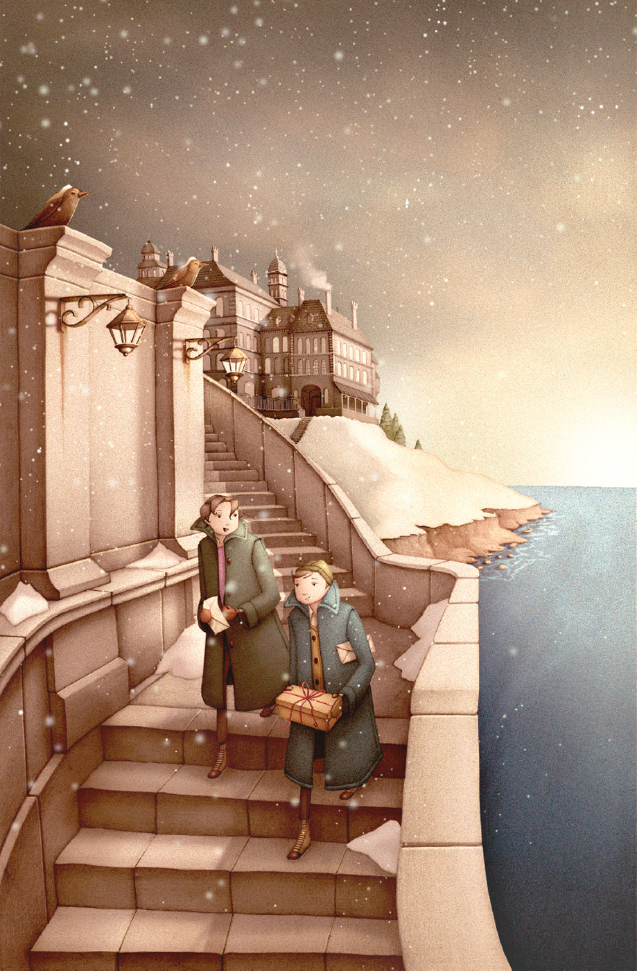 He slid it back into his slot and grabbed his letter and his other package, and they made for the school’s front entrance. Archer pulled a coat from a hook and handed a second to Benjamin. They were adult coats that went well past their knees, but they didn’t care. Benjamin followed him through a heavy oak door and down a stone walkway toward the sea.