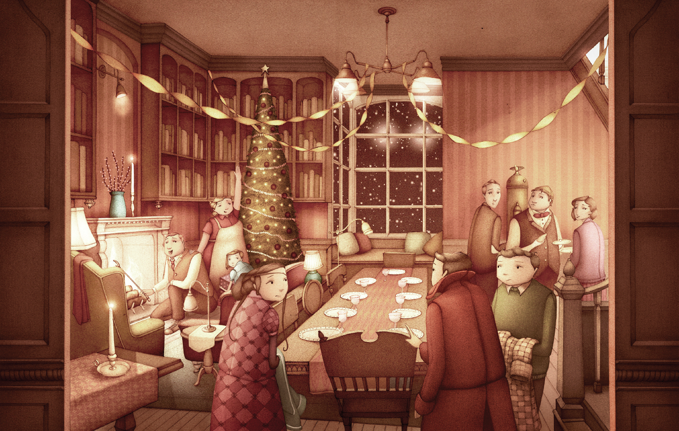 Next door, the Glubs’ house was filled with people and music and all sorts of delights. Everyone gathered in a room that, despite its chipping paint and loose floorboards, was called the great room. And it was great. Adélaïde was seated on a plaid couch before a crackling fire. Next to her were three tall windows overlooking the snowy gardens. Oliver scurried into the room and plopped himself beside her.