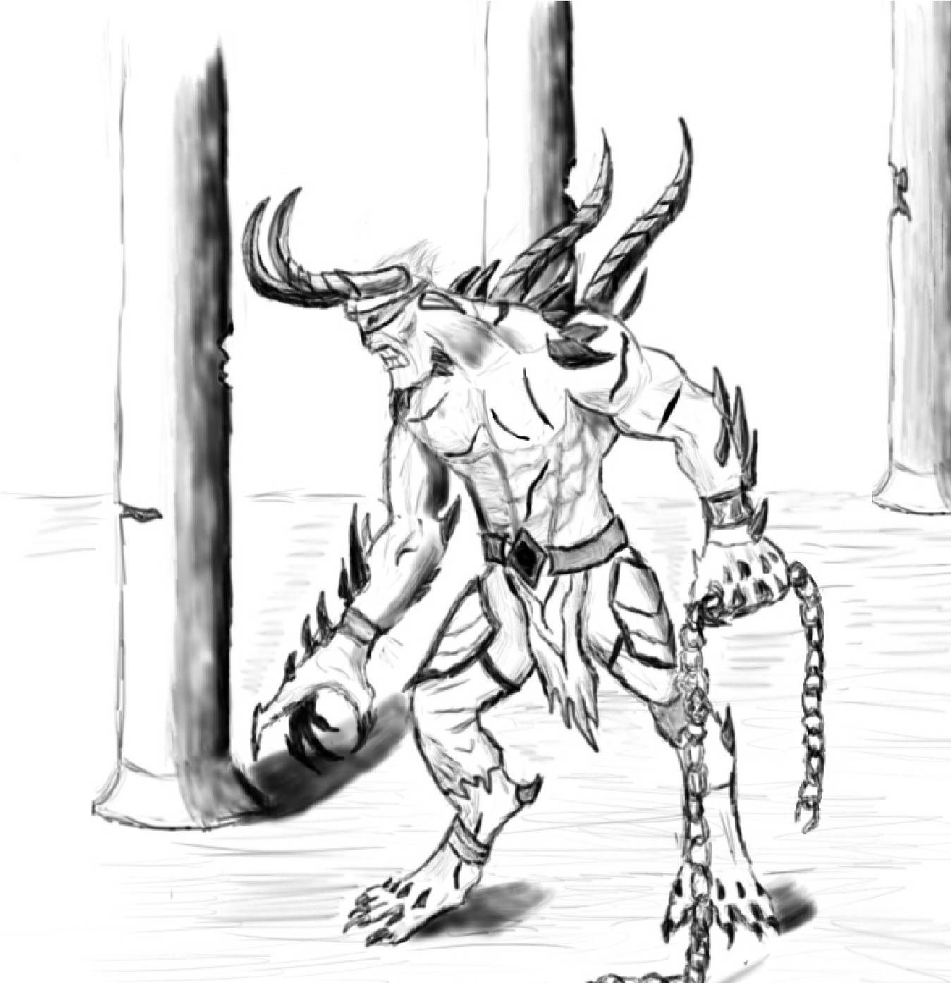 В этот момент повсюду вокруг послышался лязг цепей. Они были похожи на огромных змей, которые медленно ползли у них под ногами, издавая леденящие кровь звуки. Обернувшись к Страху, девушки его уже не обнаружили. А перед ними было огромное существо, с раскинутыми руками, которое могло обхватить целую колонну, из тех, на которых Цитадель и держалась. Почему же они не увидели этого раньше? Светлые полосы, которые Саша сначала лицезрела, были не что иное, как жилки или шрамы существа, закованного перед ними. Когда Страх попросил дам представиться, на теле проявилось ещё с десяток подобных световых линий, которые и помогли гостям определить форму и размеры тела того, кто был перед ними.