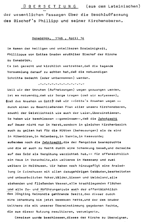 “In the name of the holy and indivisible Trinity, Phillippus of God`s Grace, chosen Bishop of the Church at Osnabrück -----“. -----“It is just and ecclesiastically justifiable, that the acting assembly pays attention to the fact, that necessary steps are to be considered (or to be undertaken).”