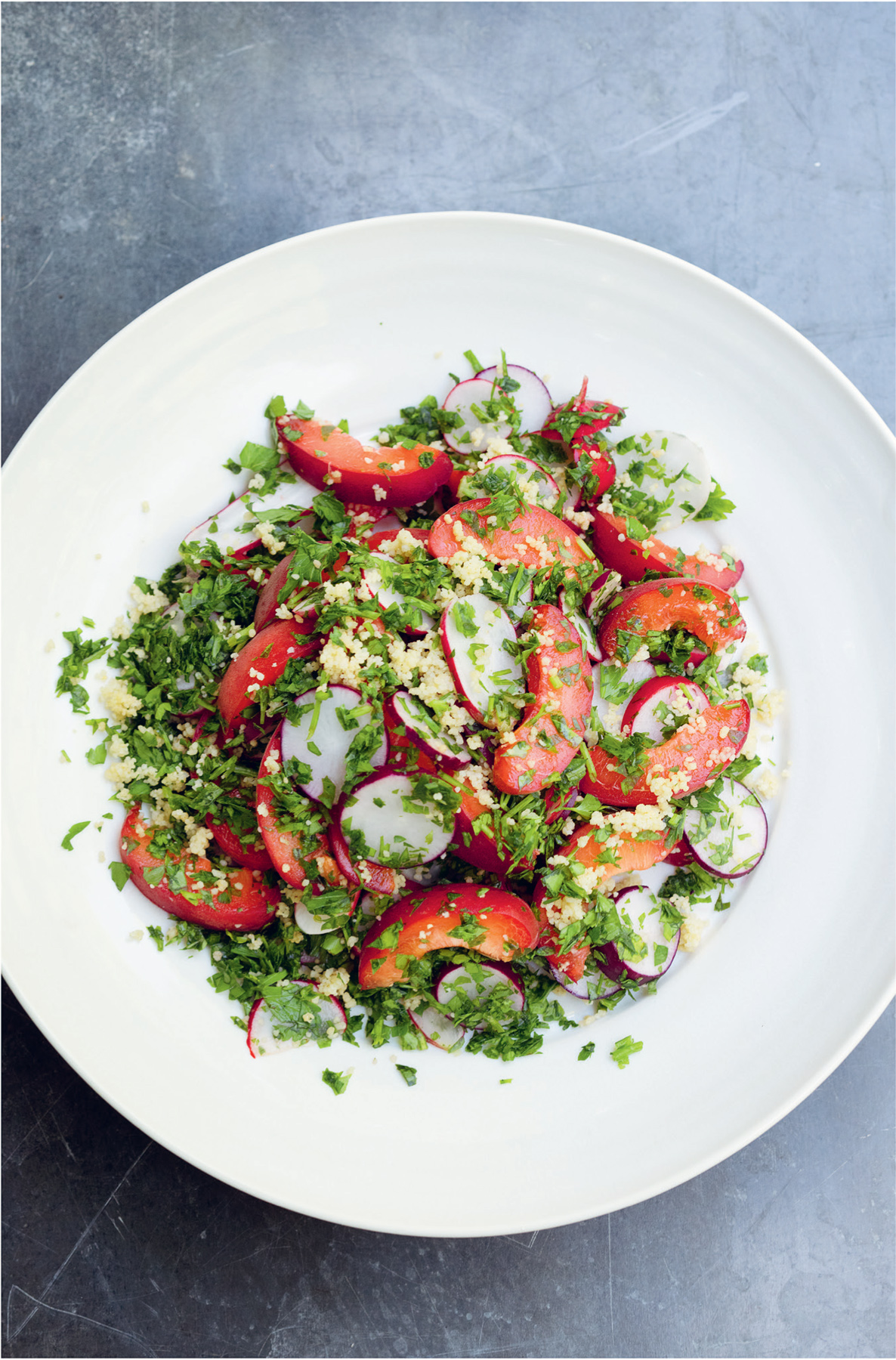 • Tabbouleh, of which this is a version, comes in many guises, but the most interesting are those that have far more parsley than grain. The herbs and fruit lend an essential lushness.