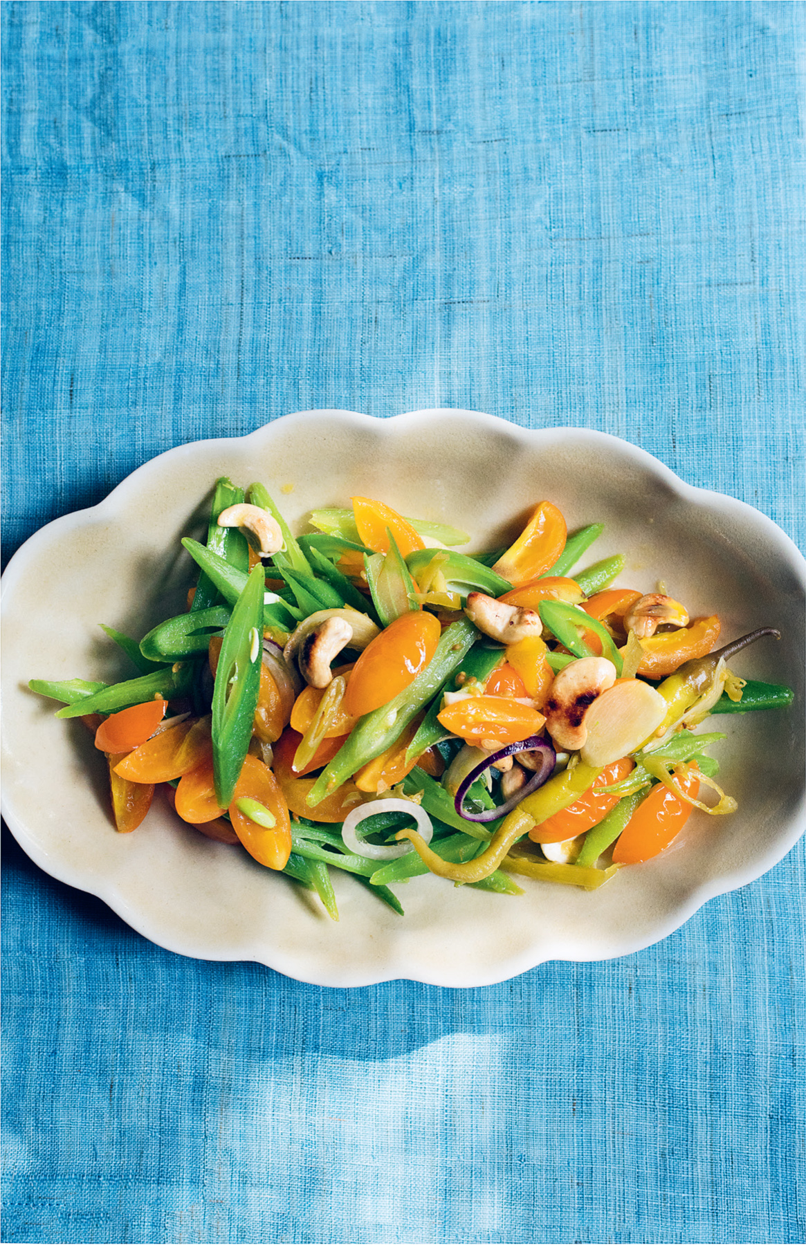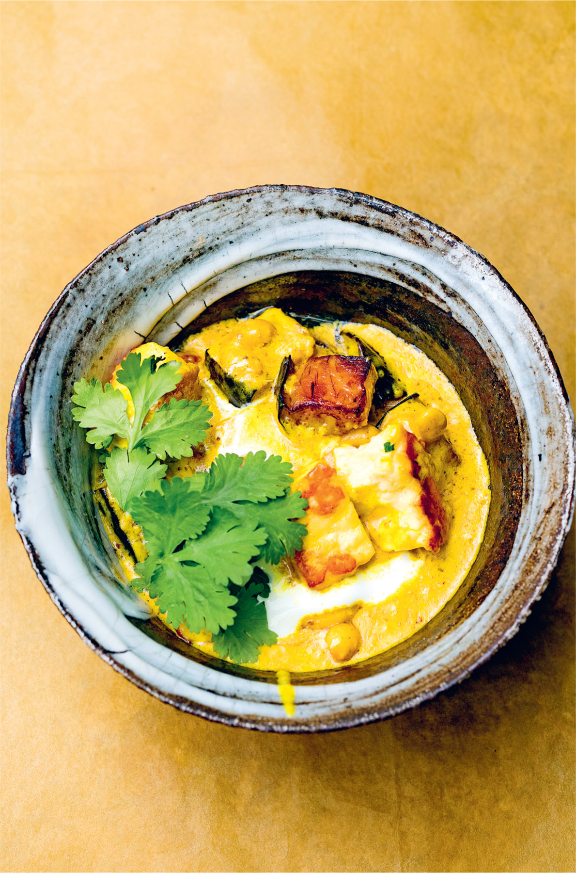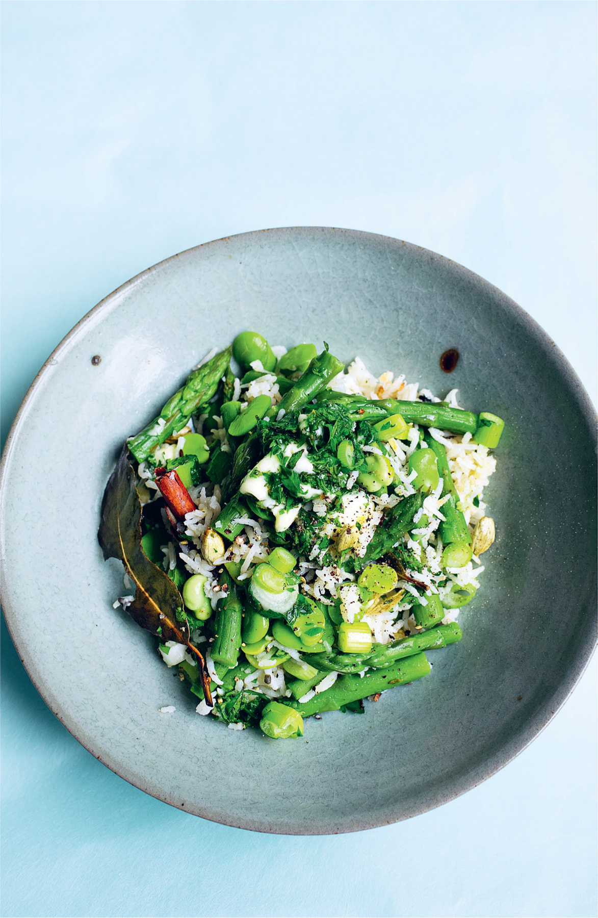 Add the asparagus tips, broad beans and peas and continue simmering for five to six minutes, then drop in a couple of handfuls of greens, shredded into thick ribbons. Finish the curry with a pinch of sugar, fish sauce, a little soy sauce and more lime.