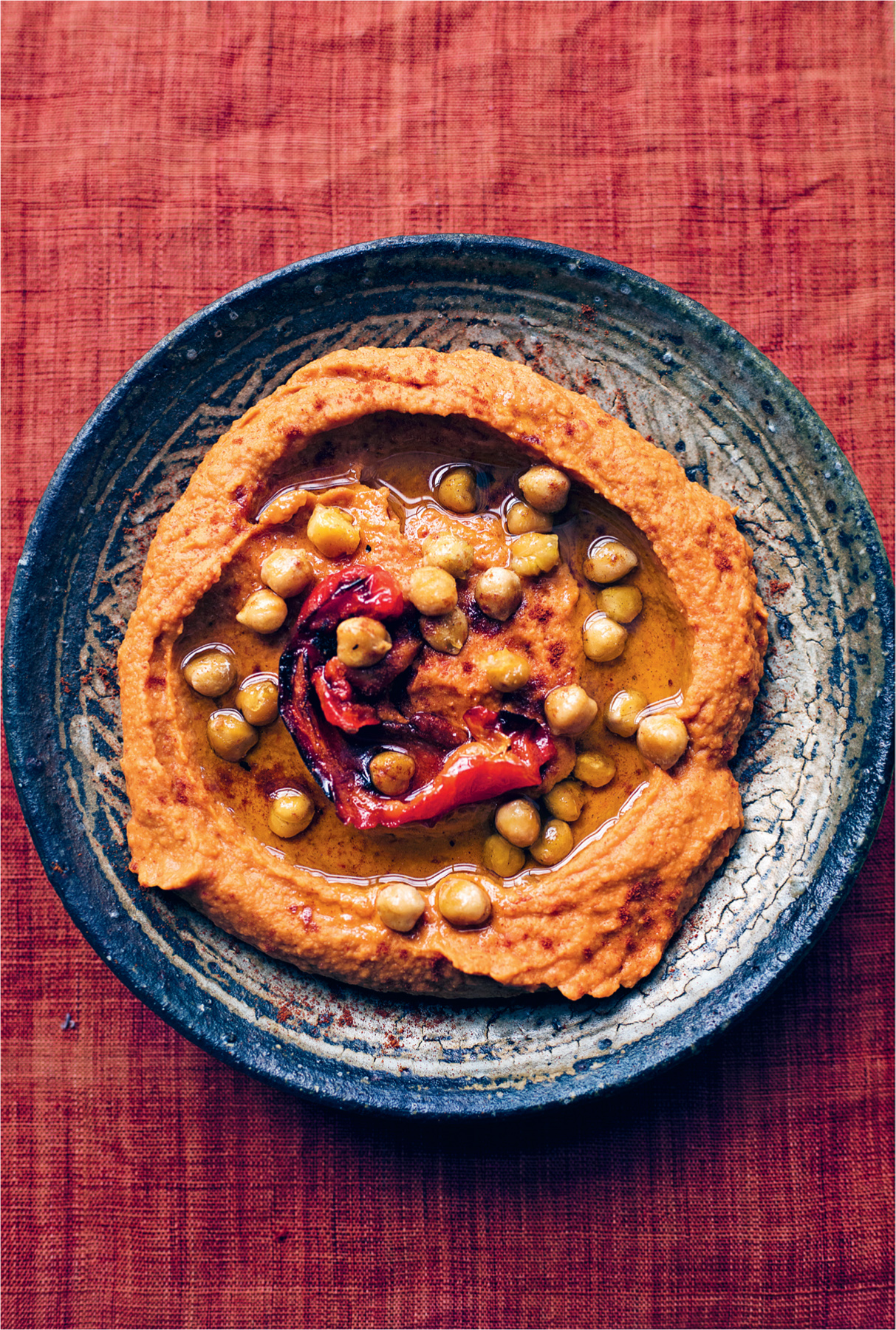 Heat the reserved chickpeas in a little olive oil in a frying pan and cook for a few minutes till they start to turn gold. Pour a little olive oil over the paste, letting it trickle into the hollow, scatter the warm chickpeas over the surface, then dust lightly with the paprika.