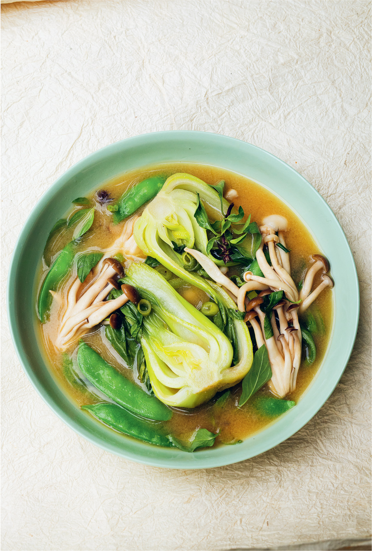 • Clear, light, gentle. I look upon this as something for those moments when you want a bowl of soup that is quietly sustaining rather than filling. A full-flavoured vegetable stock is essential, as is a generous hand with the seasoning. I tend to use chicken stock for this. I would leave the addition of soy sauce to individual diners. Just a little for me please, as I find soy sauce all too easily dominates everything in its path.