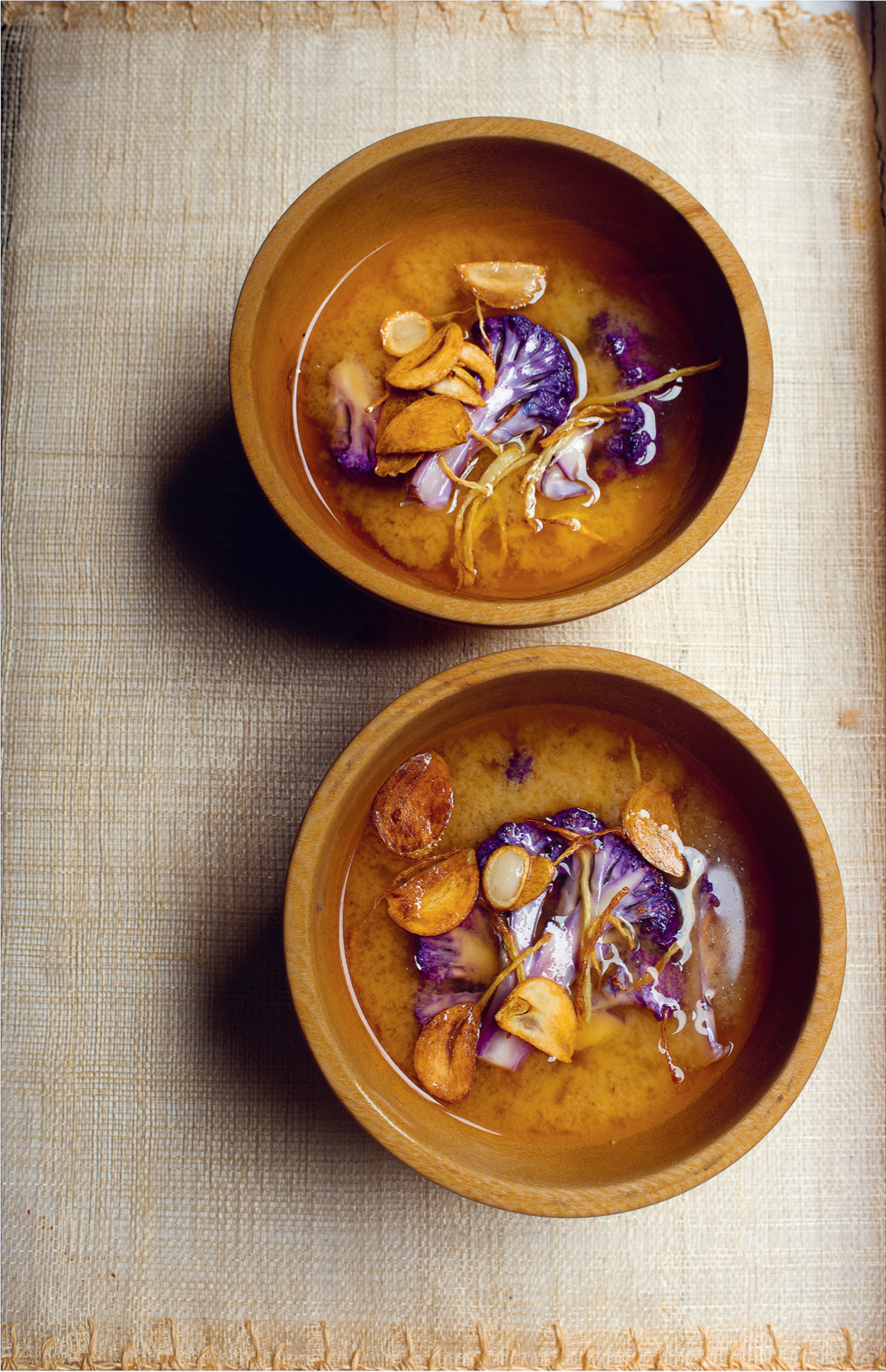 Bring 1 litre of water to the boil, then stir in the miso pastes and the mirin. Simmer for two minutes, then ladle into the bowls over the cauliflower.