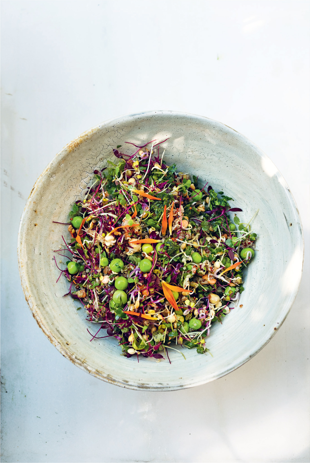 Wash the sprouted seeds in a sieve in cold running water and shake dry. Mix the peas, seeds, cress, micro leaves and petals with the quinoa and its dressing and serve.