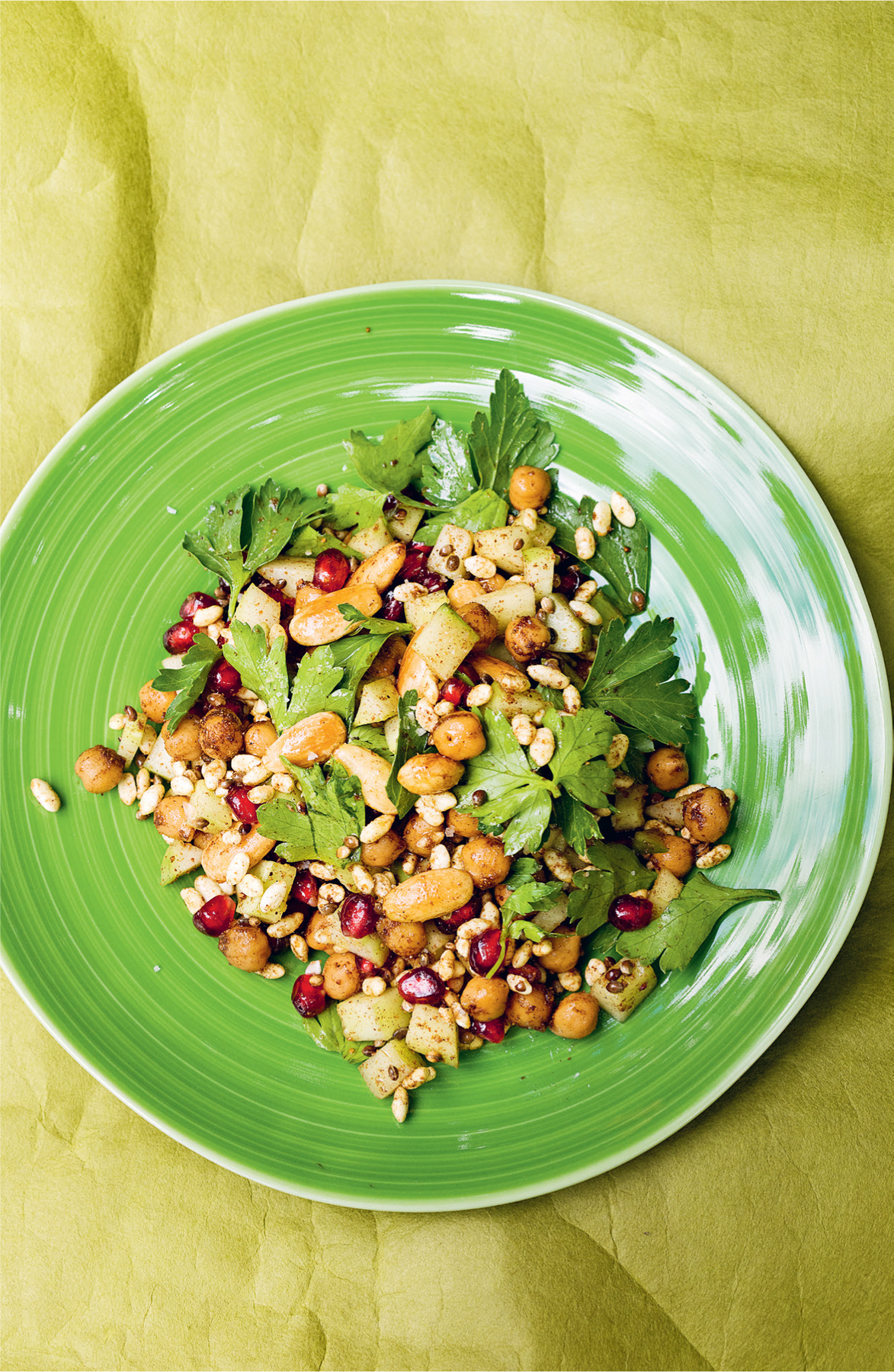 Warm the groundnut oil in the shallow pan, then, keeping the heat low, add the coriander and cumin, garam masala and curry powder, then the almonds. Warm the nuts and spices, moving everything round the pan so it doesn’t burn. Drain and rinse the chickpeas and stir them into the spices and almonds, together with the hemp and sunflower seeds and the puffed rice. Tear the parsley leaves from their stalks and add to the bowl. Tip the warm chickpea mixture into the pomegranate and cucumber, add a trickle of olive oil, then toss gently together and serve.
