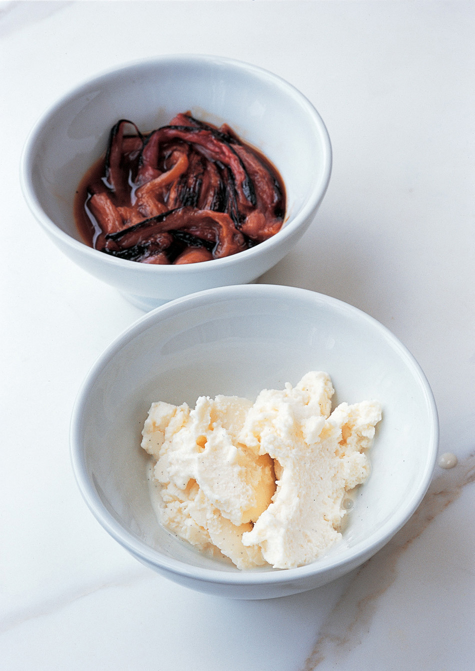 Warm, rudely pink rhubarb and snow-white frozen yoghurt has a smart, bright flavour and is breathtakingly pretty on a cold winter’s day. The frozen yoghurt is simply a bought vanilla smoothie chucked into an ice-cream machine; the baked fruit just rhubarb bunged in a dish with a spoonful of runny honey and the juice of an orange.