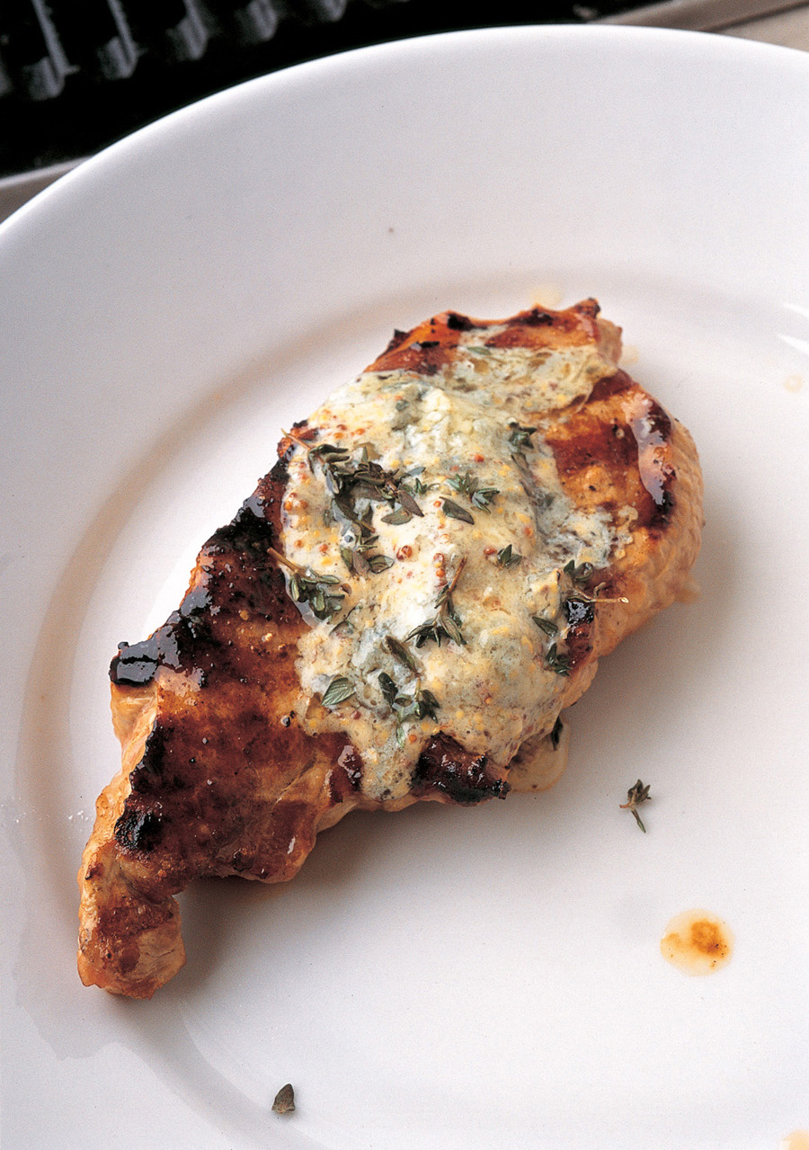 I make a quick herb butter with equal amounts of blue cheese and butter (I use 100g of each), mashed with a tablespoon each of thyme leaves and Dijon mustard, then stir in a couple of tablespoons of double cream and a grinding of black pepper. It sits in the fridge till supper, when I lay thick slices of it on grilled pork steaks. The cheese butter melts over the charred edges of the chops, making an impromptu sauce to mop up with craggy lumps of sourdough bread.