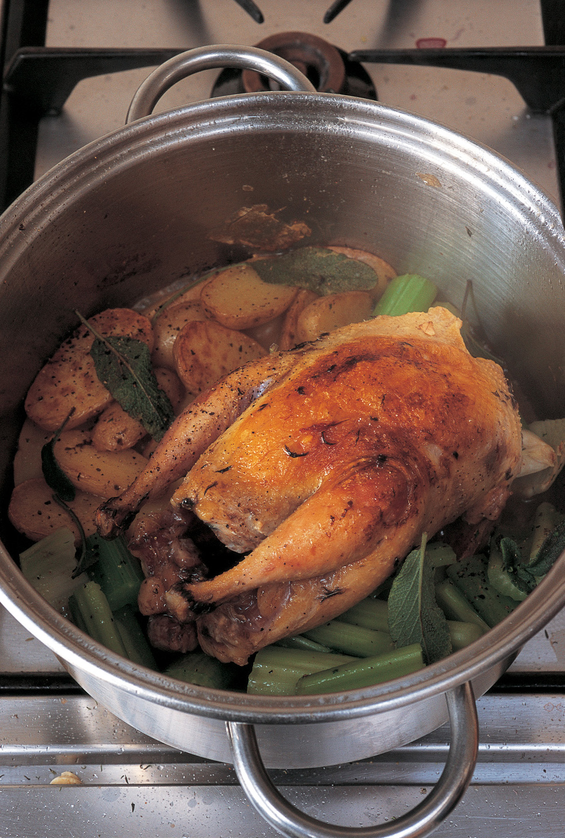 Melt the remaining butter in the pan and add the potatoes, letting them colour lightly. Then introduce the garlic, celery pieces and the sage and celery leaves and season with salt and pepper. Pour over the vermouth, bring to the boil, letting it bubble for a minute or two, then return the bird and any escaped juices to the pan. Cover with a lid and transfer to the oven for thirty-five to forty minutes.