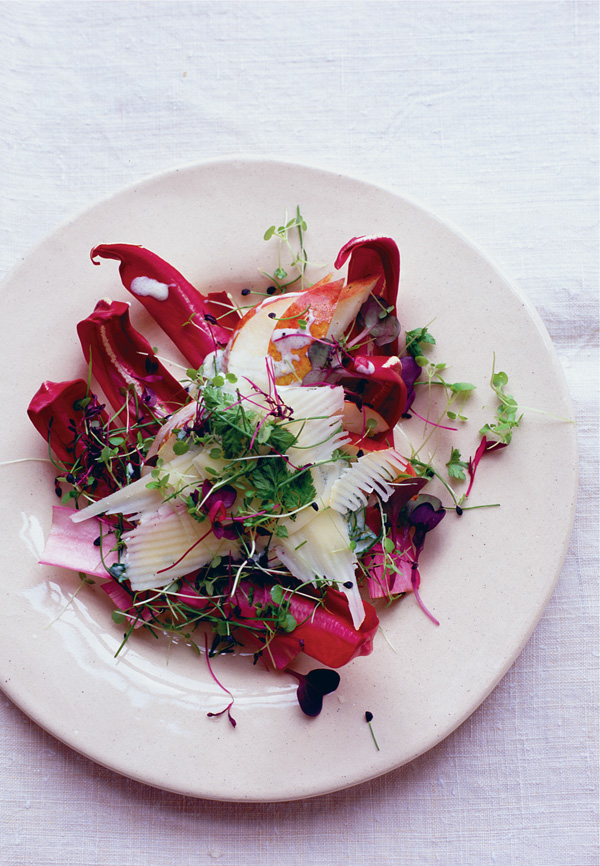 Crisp, mild, light and fresh, this is the antidote to the big-flavoured salad. I prefer to use hard, glassy-fleshed pears straight from the fridge for this, rather than the usual ripe ones. Any sprouted seeds can be used, such as radish seeds, sunflower or mung beans. The easy-to-find bags of mixed sprouts are good here, too. The cheese is up to you. Something with a deep, fruity flavour is probably best, though I have used firm goat’s cheeses on occasion too. Rather than slicing it thickly, I remove shavings from the cheese with a vegetable peeler. A sort of contemporary ploughman’s lunch.