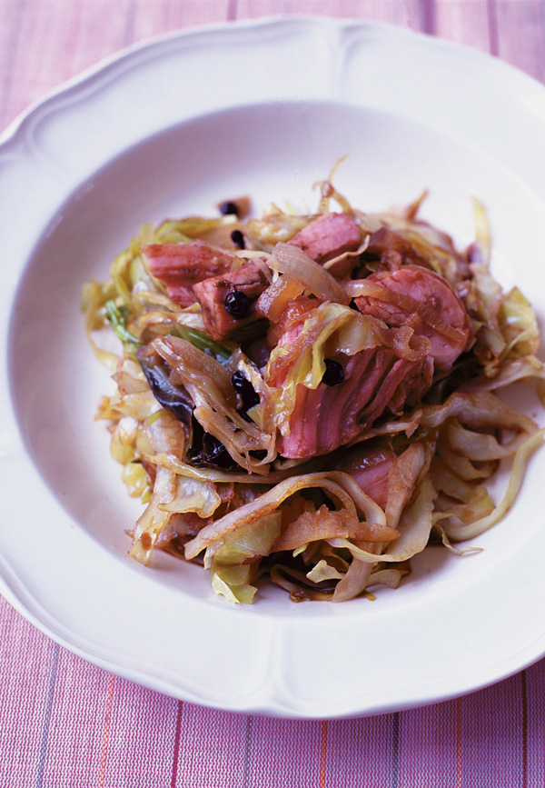 Tear or chop the ham into short, thick pieces. They are more satisfying if left large and uneven. Fold them into the cabbage, continue cooking for five minutes, then pour in the balsamic vinegar and toss in the chopped parsley. Pile into a warm dish and serve.