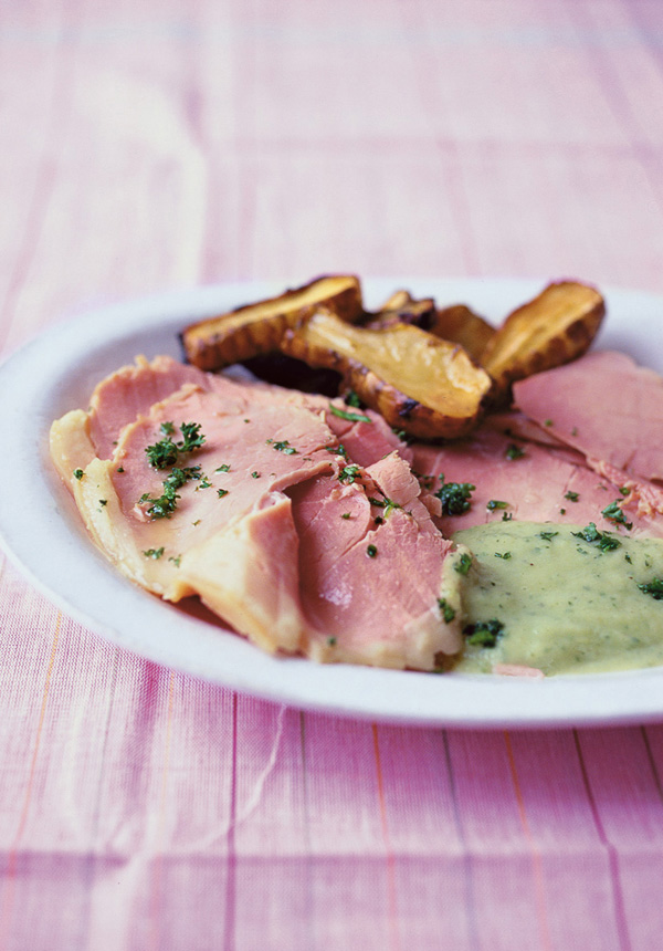 The smell of a ham puttering away in my own kitchen still reminds me of her – I suspect it always will – but now comes with a welcome. Thinly cut ham, warm from its cooking liquor, is a dish I too bring out to feed the hordes. Reasonably priced, presented on a large, oval plate with a jug of bright-green sauce, it seems to go a long way. A piece weighing just over a kilo will feed six, with leftovers for a winter salad the following day.