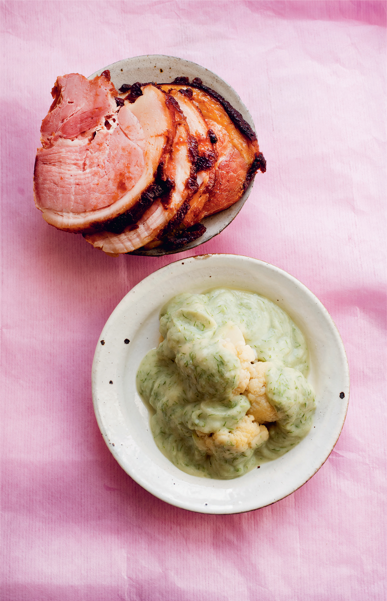 While the ham bakes, break the cauliflower into florets and place in a saucepan. Ladle enough of the hot ham stock into the cauliflower pan to cover the florets, then bring to the boil – no need to add salt. Let the florets simmer until tender, about twenty to twenty-five minutes.