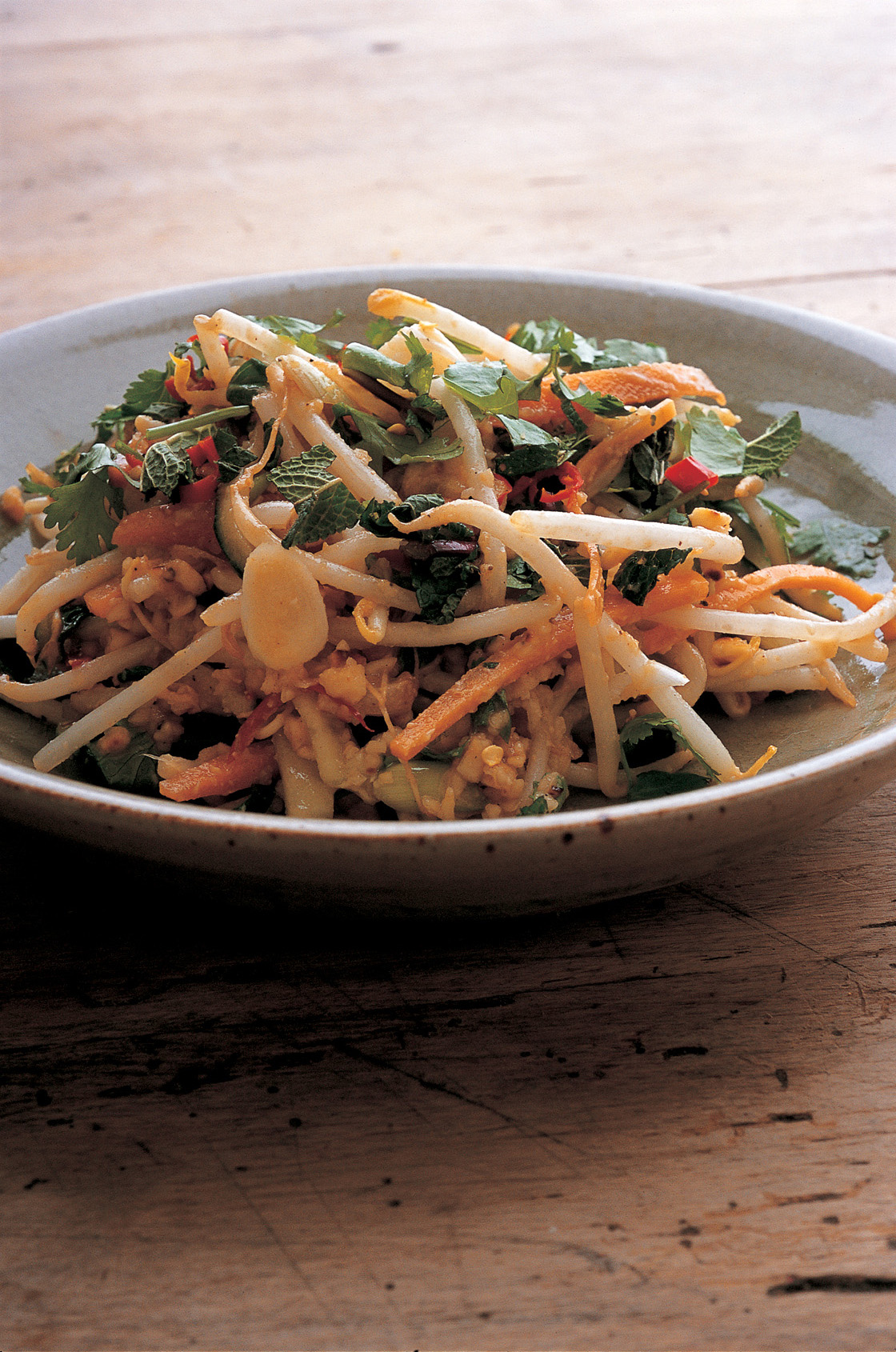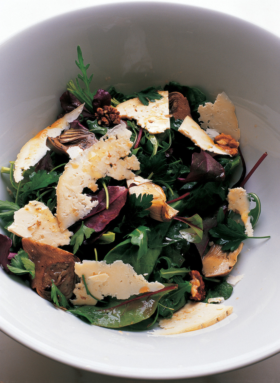 It is a bit spooky the way the contents of those ‘pillow packs’ of salad from the supermarket somehow collapse and die within what seems like minutes of opening. Yet the mixed salad leaves you buy at the farmers’ market and the ones that come from the organic boxes last several days in the fridge. The bag of leaves I picked up from Marylebone farmers’ market – baby leaves of red chard, wild rocket, oak-leaf lettuce, spiky-leaved mizuna and crunchy little Cos – is still perfect three days after I brought it home. I toss the delicate leaves and their fragile stems with large shavings of young Wensleydale, toasted walnut halves, a bunch of large-leaved watercress and the merest dribble of walnut oil and lemon juice. A gentle, softly flavoured salad of unmistakable Englishness.