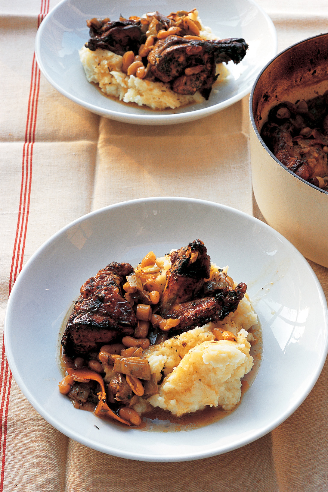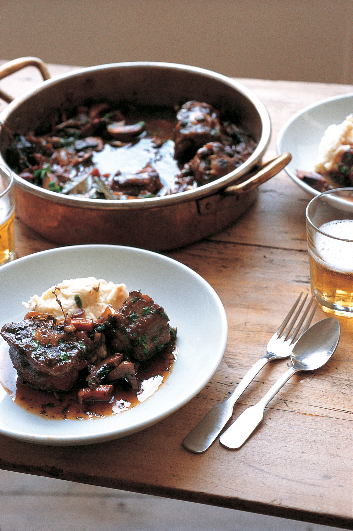 This is not a liquid stew, but one where the lumps of meat and bone are coated in a sticky, glossy gravy. Piles of creamy mashed potato, made on the sloppy side with the addition of hot milk, are an essential part of this.