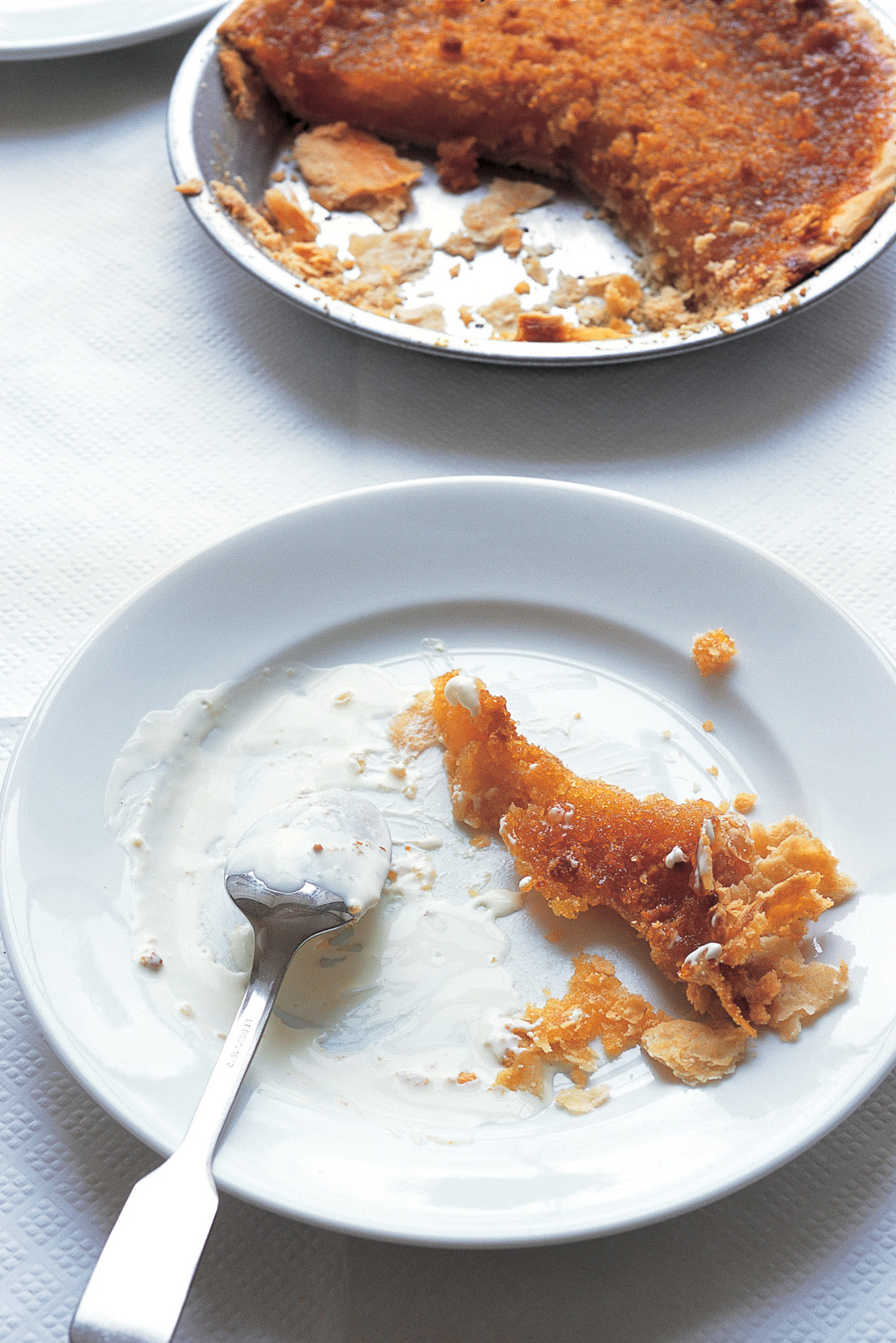 You could call this a basic domestic version of treacle tart, but that would be to undersell it. No frills, none of the oozing unctuousness of a restaurant version, just a pleasingly frugal tart with crisp pastry and a thick golden filling. I do think cream in some form or another is essential here, and by the generous jugful too. You will need an old-fashioned shallow pie plate with sloping sides about 18cm diameter (across the base).