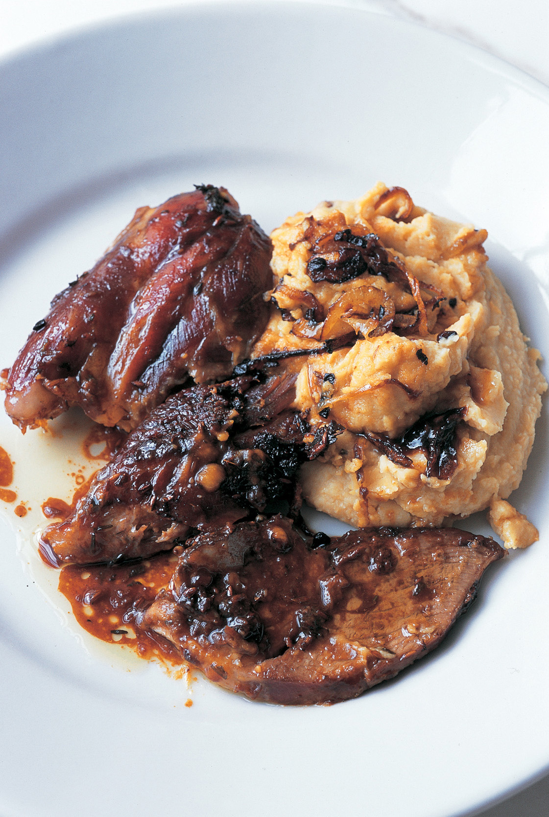 Carve the lamb, serving with the mashed chickpeas below, spooning the pan juices over both as you go.