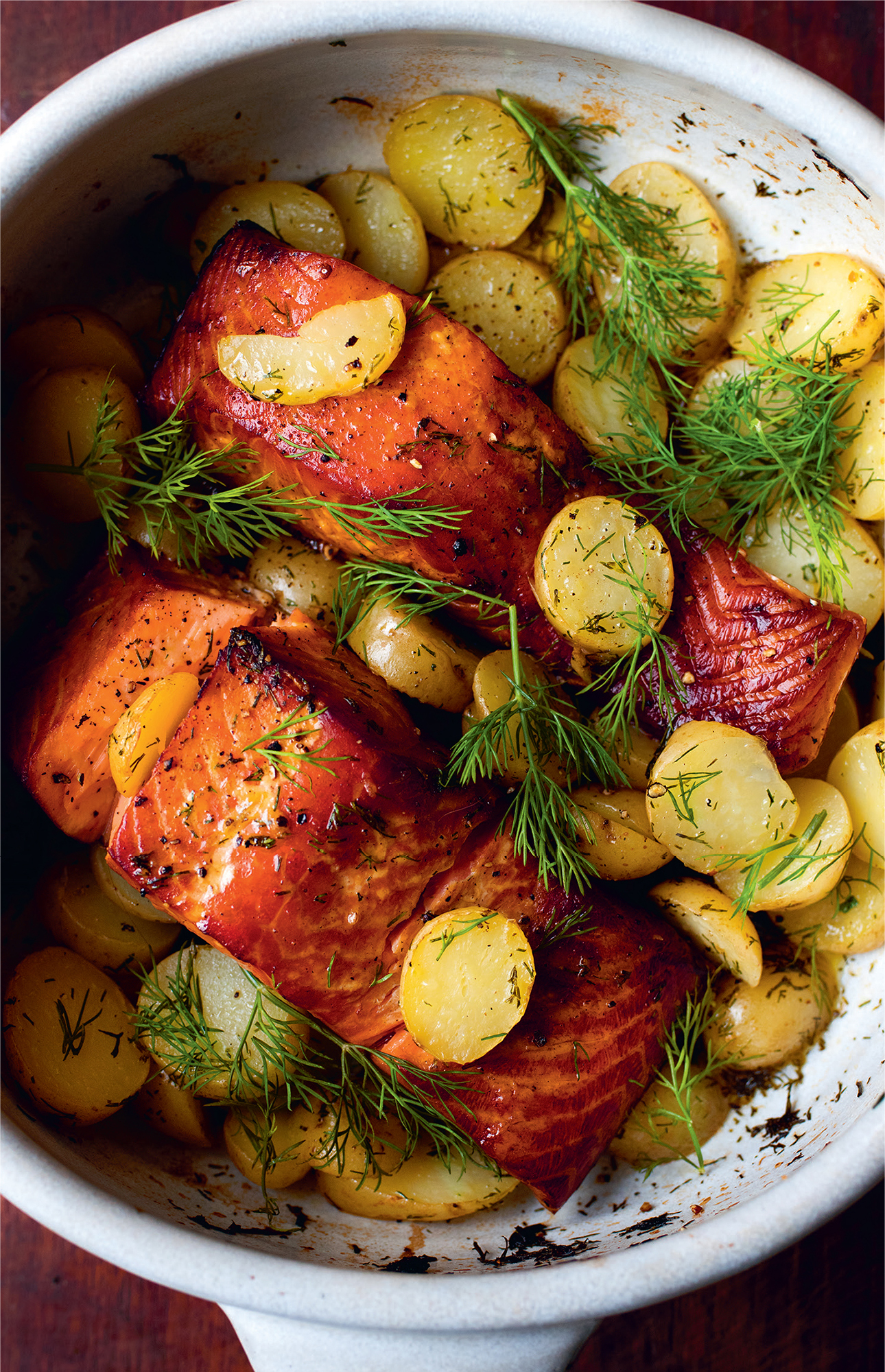 It is a rare day when I don’t make something to eat. If I am going out to dinner then I will make lunch, because I can’t get all the way through to eight in the evening. My fishmonger has pieces of hot-smoked salmon cut from the thick end of the fillet. I bake them with new potatoes and dill.