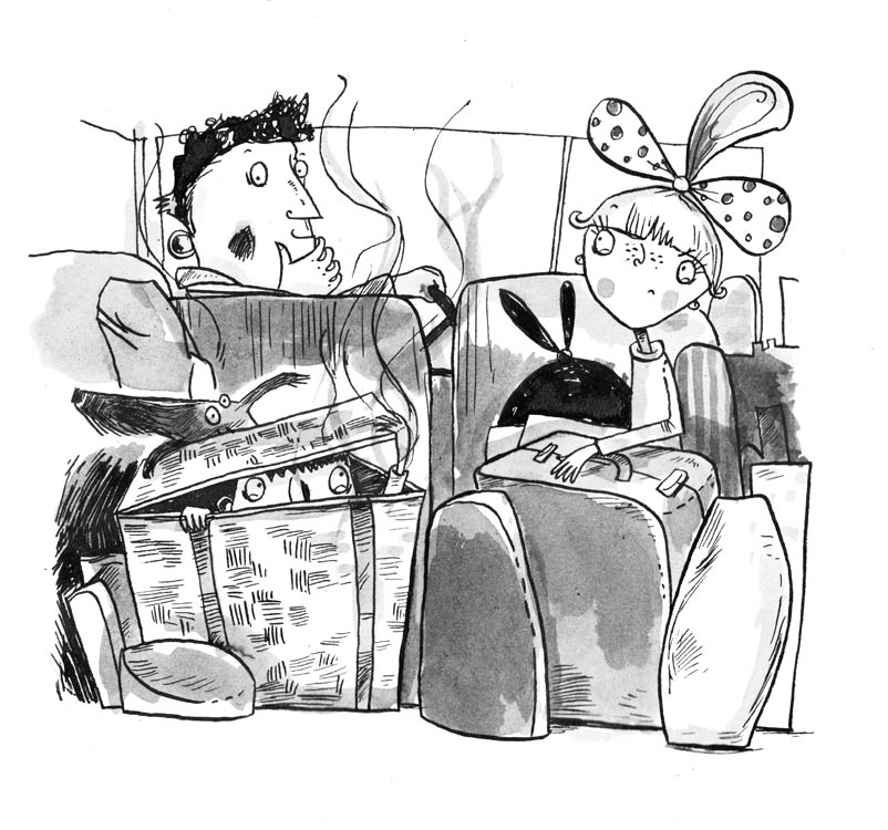 “Soon,” said Dad, watching all the passengers getting out of their cars. “We have to wait until the coast is clear.” He sniffed. “Oh no, that is bad,” he added. “We’re even getting it out here.”