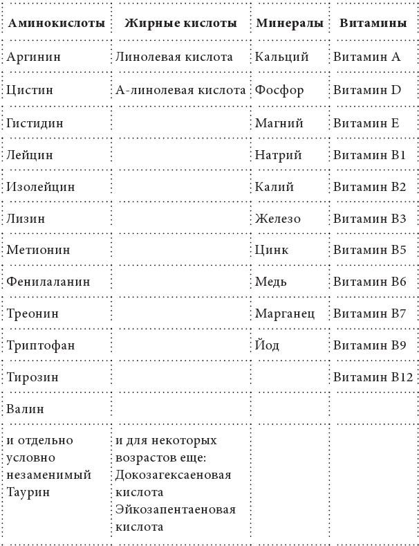 Незаменимые питательные вещества – это минералы, витамины, аминокислоты и жирные кислоты, которые необходимы организму для жизни и постоянно им расходуются, при этом они не могут синтезироваться в организме и обязательно должны поступать с едой.