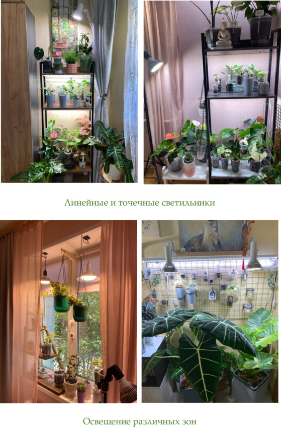 Единственно верным решением является организация искусственной подсветки, способной заменить естественный солнечный свет. Я использую светодиодные лампы мощностью от 18 до 30 ватт, преимущественно Минифермер, в которых используют светодиоды Samsung. Как показал личный опыт, эти лампы способны заменить растениям естественное освещение. В зависимости от зоны подсветки можно выбрать линейные (для стеллажей) или точечные (для досветки отдельных растений) светильники. Учитывайте вес светильников, и я бы рекомендовала надежно крепить линейные лампы, так как они могут упасть на растения, обеспечив ожог листовой пластины. Удобно будет использовать умные розетки для автоматической настройки режима освещения (12 или 15 часов). Кроме того, обычные бытовые светильники (торшеры/споты) также могут обеспечить достаточно хорошее освещение для отдельных растений, однако выдающихся результатов в росте с ними не будет.