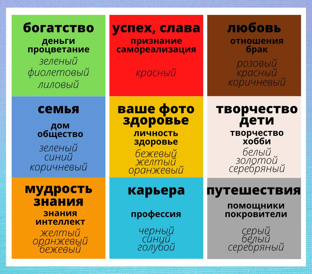 Согласно Фэн-шуй, карта желаний делится на 9 секторов, каждый из которых символизирует одну из сфер реальности – материальный достаток, любовь, карьеру, здоровье и другие. Более подробно о карте желаний мы поговорим позже. Схематично она выглядит так, как показано на рисунке 2.