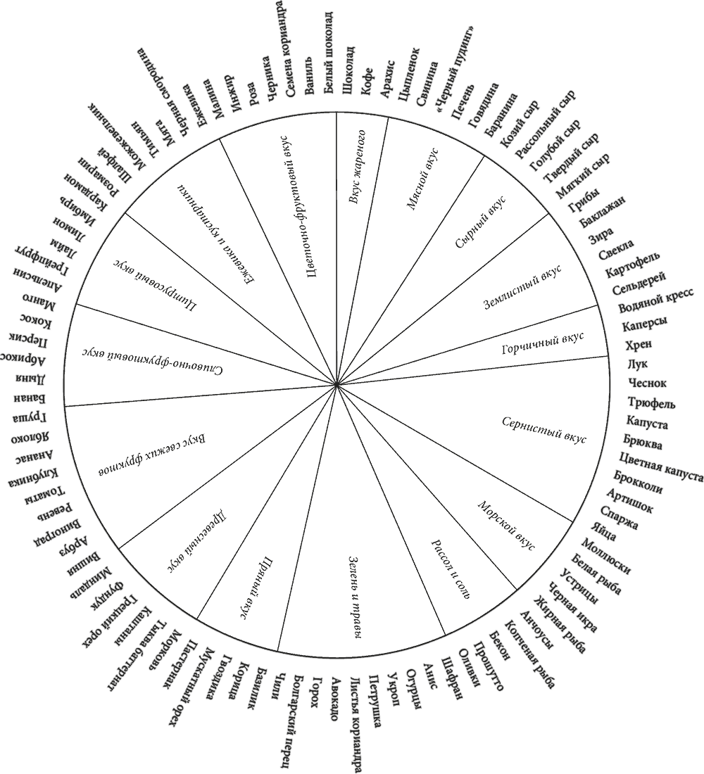 Большинство вкусов появляется в книге под своими собственными названиями. В некоторых случаях мне показалось резонным объединить схожие вкусы под одним названием. Скажем, термин «анис» охватывает семена аниса, фенхель, солодку, эстрагон и алкогольный напиток пастис (фр. Pastis). Бекон, ветчина, брюссельская капуста и обычная капуста обладают слишком большим вкусовым разнообразием, поэтому их вряд ли корректно сравнивать с другими продуктами. Хочу также сказать, что, когда дело доходило до выбора между неточностью классификации и скукой, нагоняемой на читателя бесконечными повторами, я всякий раз неизменно выбирала неточность.