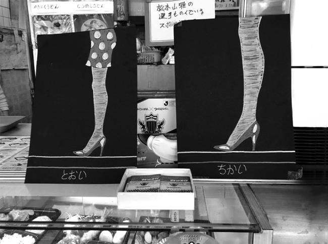Два рисунка из серии «Ближе – дальше – ближе», приклеенные к витрине магазина города Омати