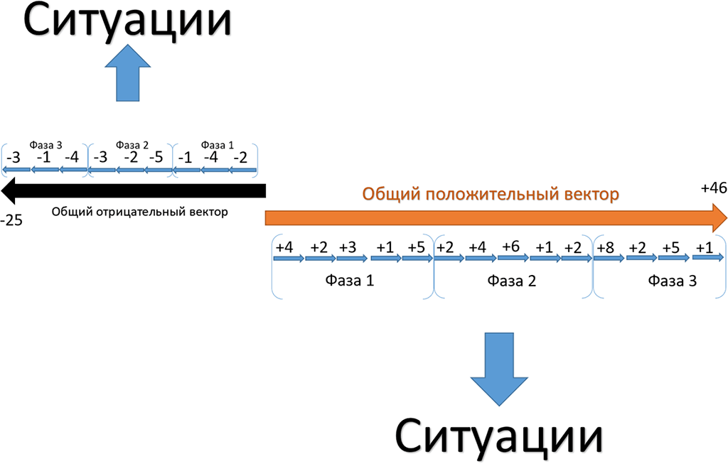На картинке вы можете увидеть модель внутрифазовой динамики, цифры условные, данная картинка показывает, что в каждой фазе динамика может быть очень разной, положительный вектор формируется из удовлетворения потребностей этих отношений, отрицательный вектор – вектор ошибки, или, иначе говоря, флуктуации, о котором мы поговорим позже.