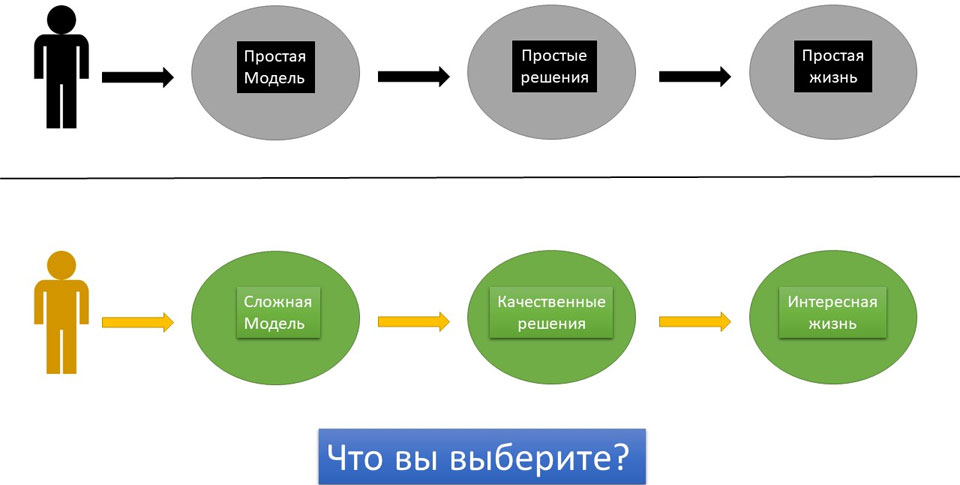 Теперь о простоте, многие люди, ища ответы в любых областях, сталкиваются с паразитической литературой с названиями по типу «Любовь за 10 секунд: все секреты любви», «Как завладеть любой девушкой/мужчиной за 5 секунд», «Все секреты счастья, или Как легко стать великим». Вся эта литература паразитирует на том, как устроен наш мозг. Помните, что такое лень? Именно поэтому наш мозг не пытается выстраивать сложные объекты, потому как это очень затратно, а пытается создать как можно быстрее любой объект, который хоть бы как-то отвечал на возникший вопрос, более того – ещё и подкрепляет минимальные энергозатраты гормонами счастья, вот откуда у нас такая тяга к простому и минимально затратным объектам, что говорить, посмотрите тренды YouTube, это прямое отражение того, что происходит с нашим мозгом, так же и любая литература, дающая простые объекты, создавая иллюзорные образы, оправдывая поведение, вызывает выброс гормонов, а следовательно, и подтверждение действия с дальнейшим его закреплением, запомните – в любой области знаний по-настоящему эффективным можно быть только имея сложные модели, которые формируются не один и не два года, а много, много лет и никогда не заканчивают усложняться, поэтому, если вы видите, что-то простое, стоит насторожиться как минимум, реально полезная информация всегда непростая, а следовательно, тяжело усваиваемая по причине энергозатрат, из этого можно сделать вывод, что не стоит искать простых ответов, они все неэффективны. Тогда вы спросите, но как же заниматься сложными вещами, если биология этому противоречит? На самом деле это частично, так наш мозг – это всего лишь сложно алгоритмизированный механизм, работающий на простых принципах, т. е. то, что мешает, может работать и в обратную сторону, нет, конечно, лень невозможно победить, но можно создавать доминанту потребности в сложном, через понимание, зачем же это нужно, как уже было сказано выше, лишь сложные модели по-настоящему эффективны, а следовательно, если вы хотите чего-то добиться в этой жизни и иметь вес, то вы просто вынуждены быть эффективным, иначе говоря, иметь сложные модели, как минимум это понимание создаёт движение потребности в нужное русло, далее, когда появилась доминанта, необходимо начать изучать ту область знания, которая для вас референтна, после нескольких месяцев работы над этим вы станете сложнее, а следовательно, будете более эффективным в этой области, из этого выходит, что вы более конкурентоспособный, это позволит вам занимать более доминирующие позиции в социальной среде, что приведёт к огромному удовольствию, т. е. механизму подтверждения и закрепления действия, дальше будет проще действовать, потом у вас возникнет привыкание к стандарту, на котором вы находитесь, и прогресс может остановиться на некоторое время, т. к. пропадёт потребность в нём, но, я вас уверяю, это до тех пор, пока вы не столкнётесь с конкуренцией, и так по кругу, также есть большие плюсы в том, чтобы бросать себя в жёстко конкурирующую среду, уверен, понимаете почему. Вы скажете – а как же учёные, ведь у них как таковой конкуренции нет, они там думают что-то себе в голове, и максимум, с кем конкурируют, это с формулами и доской, на которой пишут, или со студентами, но ведь это всё вызывает привыкание, и как же их голова работает без этих подкреплений? На самом деле