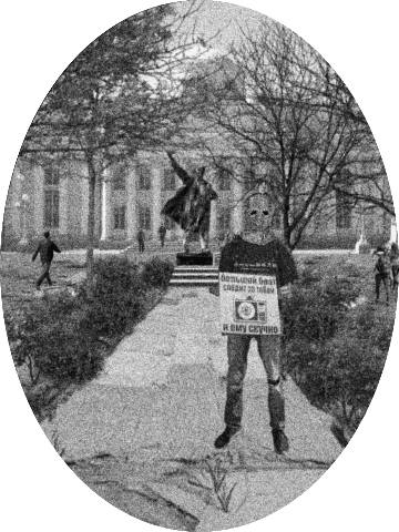 По пути к библиотеке, детектив решил пройти через центральную лестницу, при вхождении на которую перед тобой красовался вождь коммунистического светлого будущего, он встретил странную персону, у которой у горла перевязанный крепкой веревкой мешок из под картошки и плакат, который вещал всем тем, кто его заметил, следующее: «Большой брат следит за тобой и ему скучно». Помимо яркой фразы был и рисунок фотоаппарата, который давал наглядное представление того, о чем написал чудик.