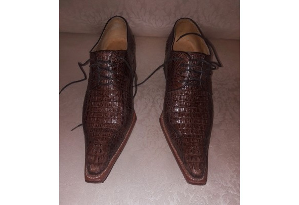 Всю обратную дорогу просидев в белых носках, Лаврентий так усердно начищал свои новые туфли, что в них можно было увидеть свое зеркальное отражение и даже запросто побриться. Лаковая имитация крокодиловой кожи, острые мыски, 43 размер.