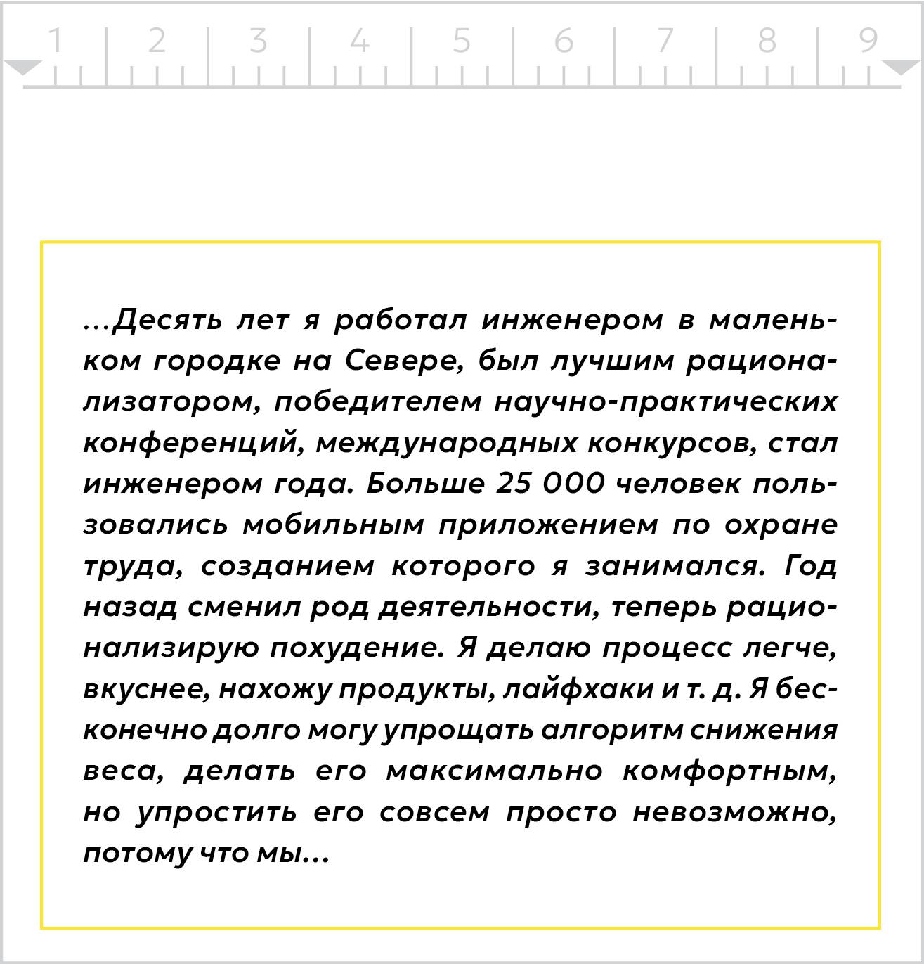 Люблю все упрощать, и мне нравится рационализировать похудение. Я все думал: «Как помочь людям не срываться и дойти до конца?» – и настолько погрузился в тему, что трижды бросал себе вызов, затевал челленджи, в ходе которых набирал жир и в итоге сбрасывал 30 килограммов за 4 месяца. Я все попробовал на себе и знаю, как легко, просто и быстро пройти этот путь. И сделал это в четвертый раз, чтобы написать книгу.