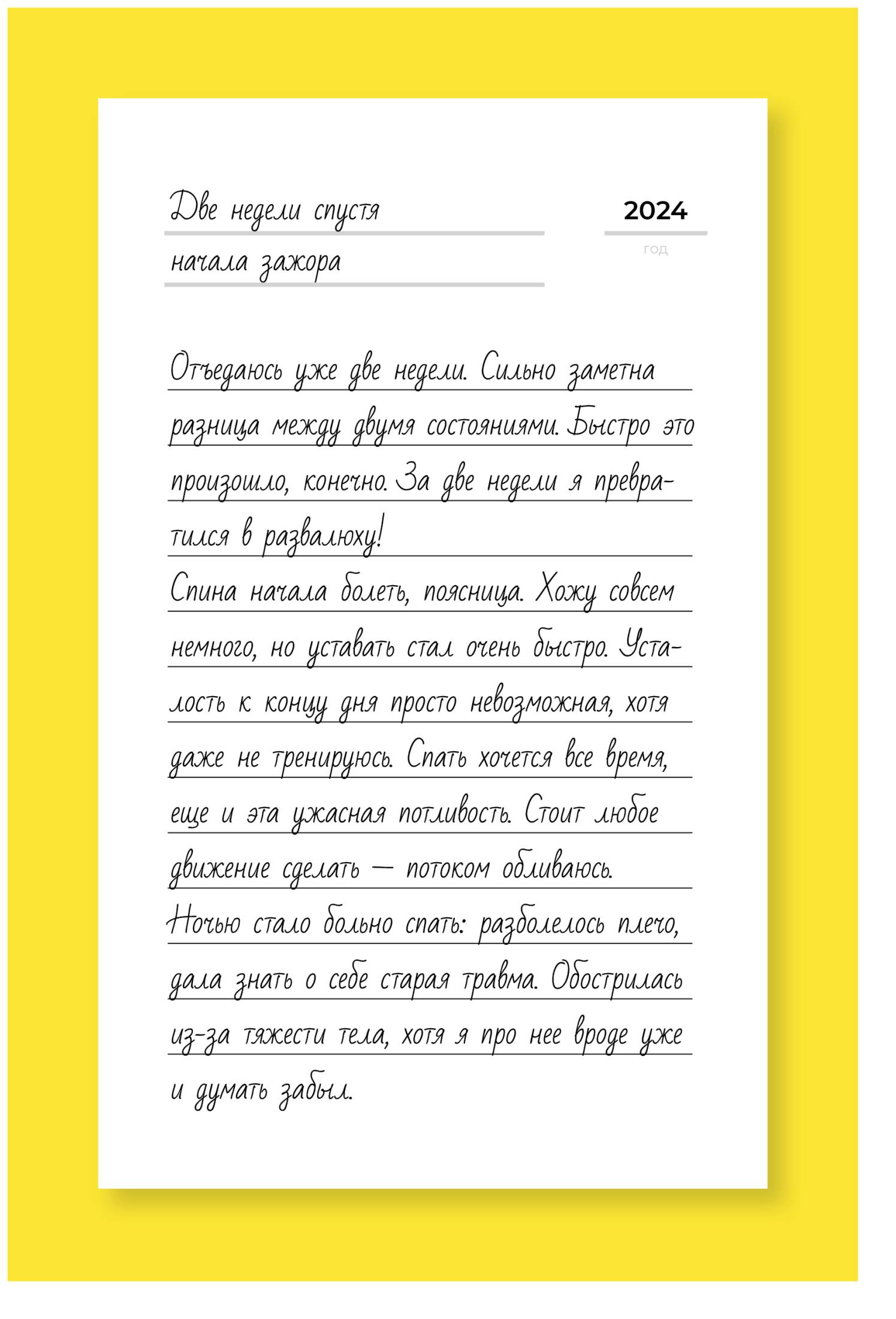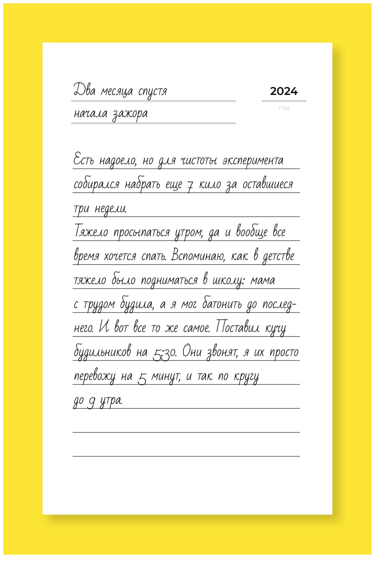 Поначалу мне не нравился мой зажор, я хотел вернуться к старым привычкам, но спустя три месяца новый режим питания стал для меня нормальным – привык. Действия, которые мы совершаем каждый день, определяют наше состояние. Наши изменения – наша привычка. За месяц я набрал 18 килограммов. Вес прибавился резко, едва ли не плюс 15 килограммов за две недели. Затем прибавка в весе стабилизировалась, и началась рекомпозиция: количество мышц в теле стало уменьшаться, жира – прибавляться. Ведь я не тренировался, и мышцы организму стали не нужны – мы адаптируемся ко всему, даже к ничегонеделанию.