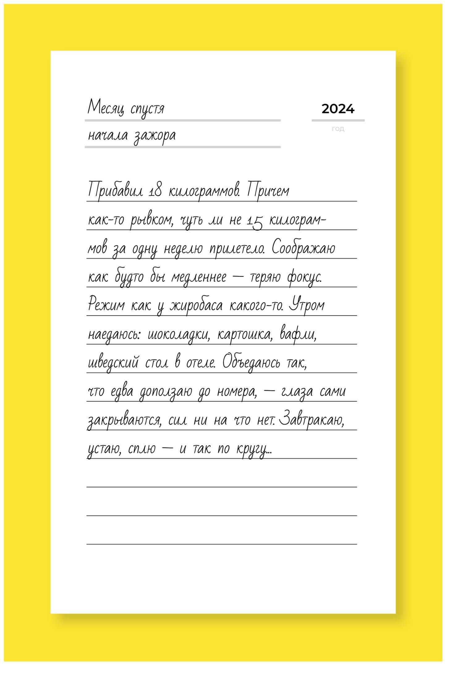 Однажды я представлял, что участвую в создании фильма на эту тему: как меняется мышление человека, когда он набирает лишний вес. Годами мы можем испытывать сложности со здоровьем, неудобства в быту, при покупке одежды, в любых активных действиях и ничего с этим не делать. Меня расстраивало, что люди с избытком массы тела живут со своими проблемами и не знают, как подступиться к их решению. Почему так легко говорить об образе жизни, когда мы находимся в хорошей форме, и так сложно менять привычки, когда мы «расплылись»? Я по себе знаю разницу в мышлении толстого и худого человека. И прямо сейчас возвращаю себя в прежнее «увесистое» состояние, чтобы оттуда более понятно рассказать, как можно легко похудеть. Да наступит «зажор»!