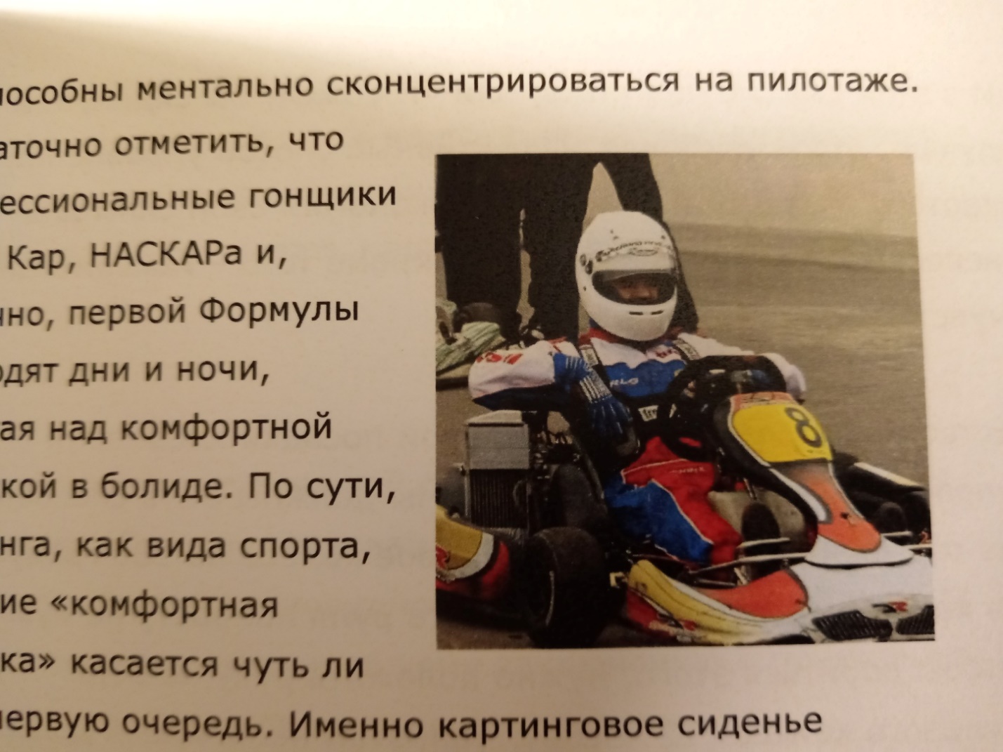 – Итак, подводя итоги нашей первой лекции курса, отмечу следующее. Сегодня мы с вами знакомимся с прокатным картингом. В этой разновидности автомобильного спорта (а мы с вами уже пришли к общему заключению и пониманию, что занимаемся автоспортом, а не фривольными покатушками) трудно говорить о правильной (комфортной) посадке, выстроенной под конкретного пилота, – у нас есть прокатный автомобиль, как некая данность, и мы должны показывать на нем результат.