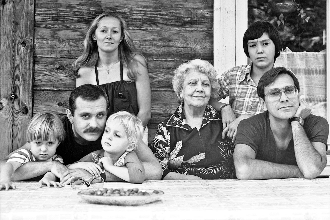 Слева направо: Анна и Артем Михалковы с отцом, за ними Татьяна Михалкова, Наталья Петровна Кончаловская, Андрон Кончаловский, за ним – Егор Кончаловский