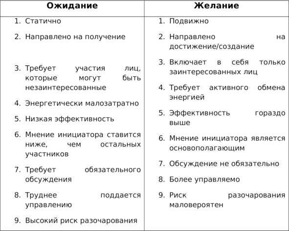 Чтобы стало понятнее, давайте разберёмся, в чем же состоят различия «Ожидания» и «Желания» на примере их характеристик.