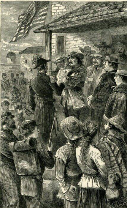 Сцена американо-мексиканской войны 1846- 1848 годов- генерал Карни- «отец американской конницы»– объявляет Нью-Мексико частью США. Вопрос о судьбе бывших территорий Мексики внутри США станет одной из причин развязывания Гражданской войны (разногласий между Севером и Югом к 1860-ым годам становилось всё больше). Многие генералы войны с Мексикой станут ветеранами и этой войны. Сам Карни не доживет- умрёт в том же 1848 году