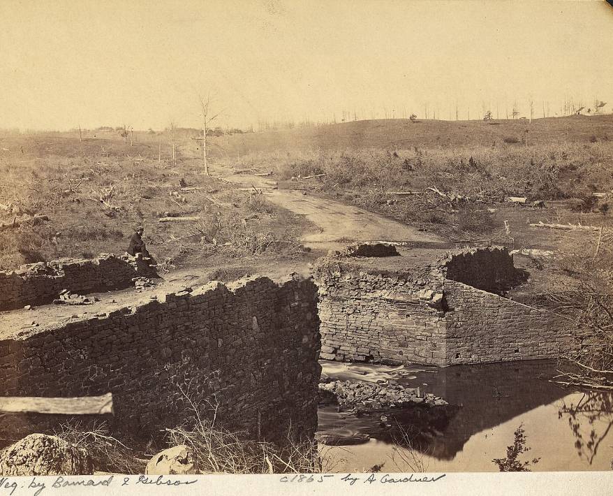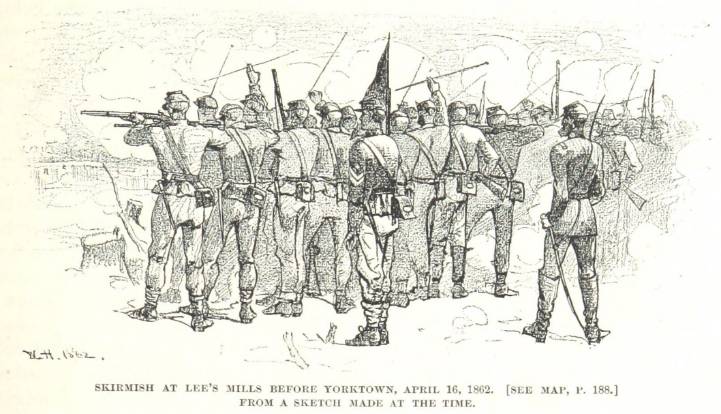 Перестрелка у плотины номер 1. Событие, судя по надписи, 16 апреля 1862 года. На фото видно, что войска всё ещё используют линейную тактику, при котором солдаты находились плотнее друг к другу, что во времена распространения более точного нарезного стрелкового оружия и картечниц привело к большим потерям. Гражданская война до сих пор является самым кровопролитным конфликтом в истории Соединённых Штатов