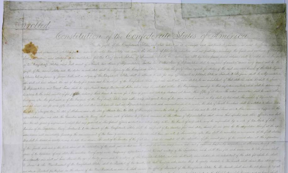 После объявления о Сецессии вначале Южной Каролиной, а затем ещё шестью штатами Юга, к 11 марта 1861 года Конфедеративные Штаты Америки приняли конституцию и объявили временной столицей город Монтгомери в штате Алабама (позже ею станут Ричмонд, а затем и Данвилл). На фотографии- вторая конституция (первую приняли ещё 7 февраля, но действовала она лишь до марта)