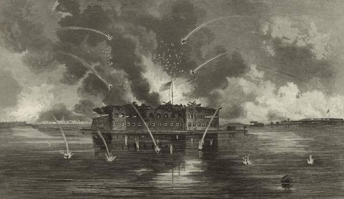 Гравюра, показывающая первое сражение Гражданской войны- блокаду, а затем и взятие южанами форта Самтер 12—13 апреля 1861 года (Чарльстон. Штат Южная Каролина). Автор работы- Джордж Эдвард Перин