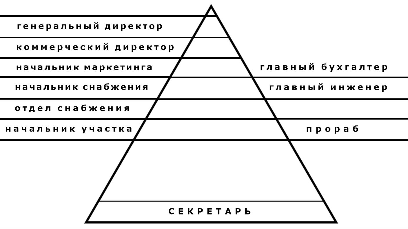 Рассмотрим структуру строительной компании, представленную на рисунке выше. Из неё становится очевидно, что секретарь занимает самую низкую позицию в иерархии. Секретарь не принимает решений, и если вы будете обращаться к нему, то не сможете продвинуться дальше.
