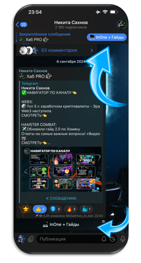 На этом скриншоте мы видим пример того, какой можно создать пост для канала с кнопкой, после чего закрепить его, и в вашем канале будет кнопка на указанный вами ресурс. Здесь, например, ссылка на мой «Хаб» – это приложение, в которое может зайти участник канала и посмотреть видео, гайды и многое другое, что размещено в моём хабе. Позже, если вы хотите использовать InOne и собрать свой Хаб для канала, этот этап будет описан далее в книге.